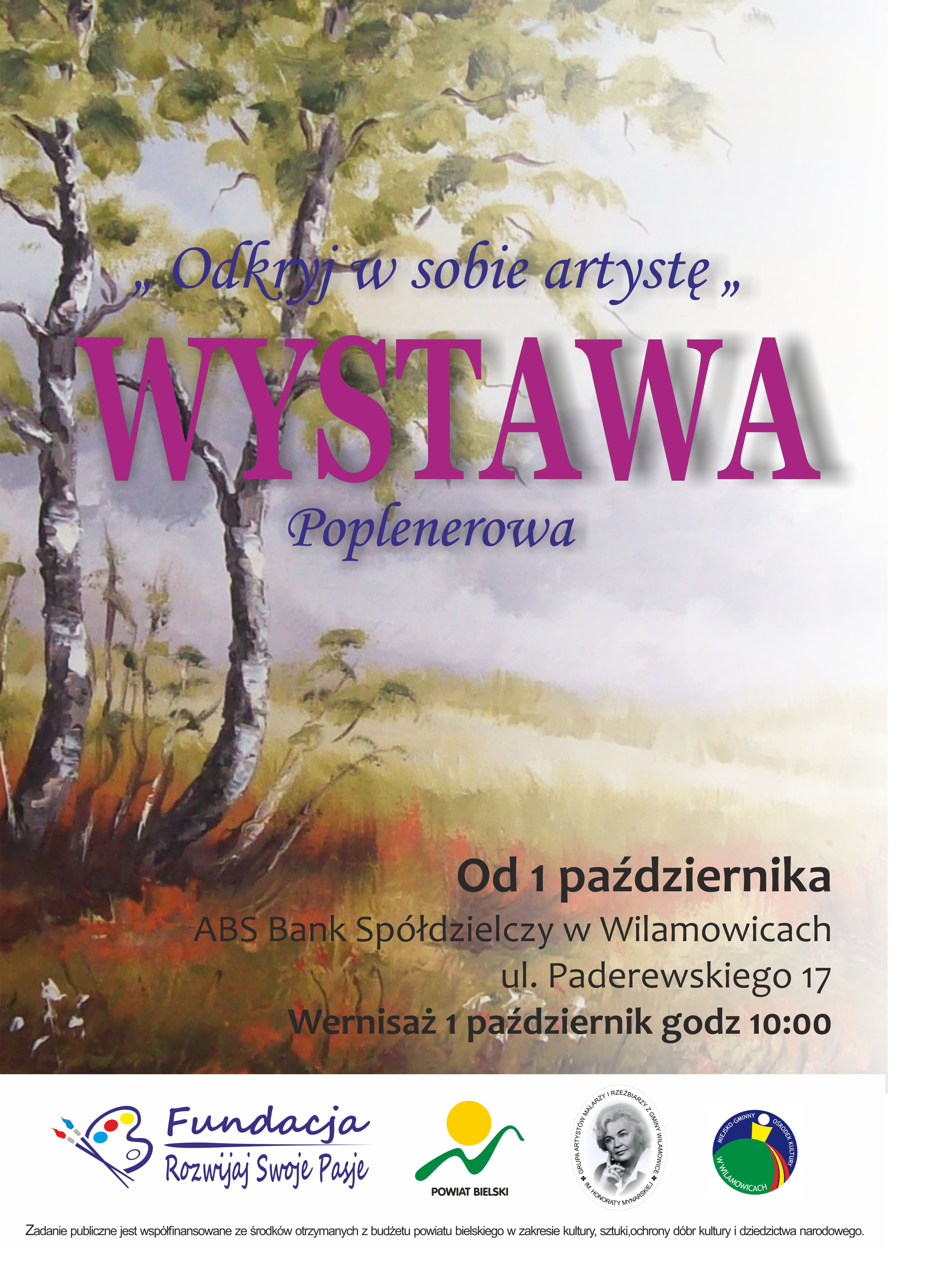 Serdecznie zapraszamy na wernisaż wystawy "Odkryj w sobie artystę", który odbędzie się 1 października 2025 r. o godz. 10:00 w ABS Bank Spółdzielczy w Wilamowicach ul. Paderewskiego 17.
